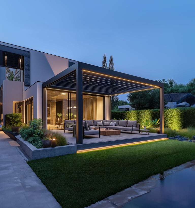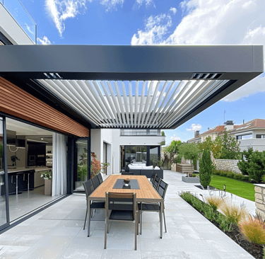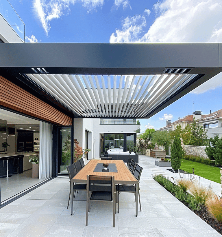 Wanneer dit wordt gecombineerd met grote glaspartijen en een luxe terrasoverkapping, ontstaat er een ruimte die het hele jaar door bruikbaar is. Onze aluminium pergola’s bieden hier de perfecte structuur; ze vormen een architecturaal kader dat de lijnen van de woning doortrekt naar de tuin.